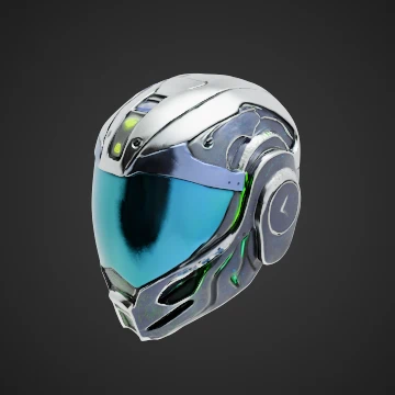 A sleek, futuristic helmet designed for urban explorers. The helmet features a streamlined aerodynamic shape with integrated LED lights that illuminate the front visor. The primary material is a high-gloss polymer with a metallic finish, giving it a reflective appearance. The inner surface is padded with synthetic leather for comfort. This model is adorned with intricate engraved circuitry patterns, showcasing advanced technology. The color scheme includes gradients of deep blue and silver, with glowing accents in neon green. The design blends elements of cyberpunk with a modern aesthetic, making it ideal for sci-fi game characters.
